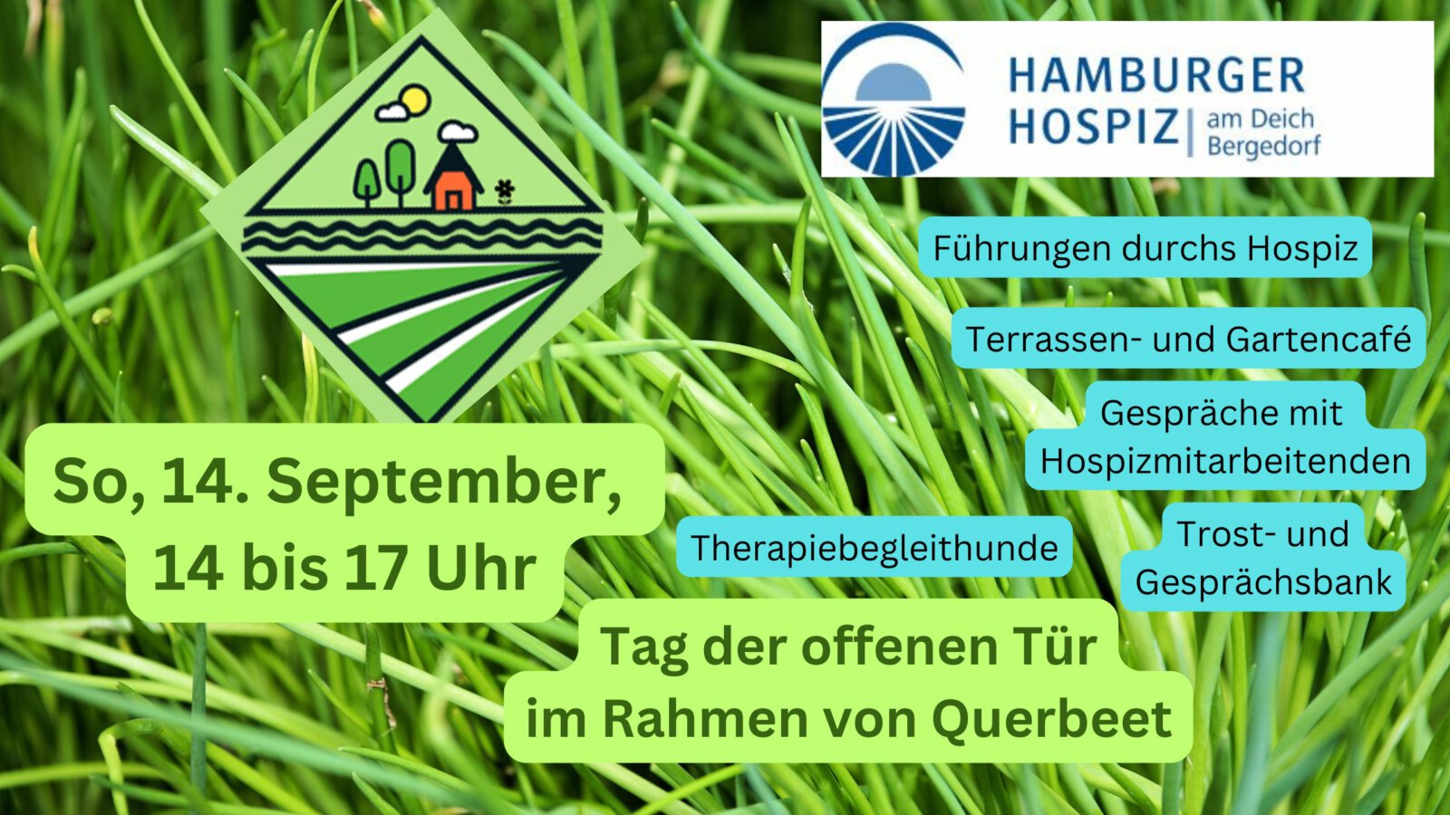 Wir freuen uns auf viele schöne Veranstaltungen und Begegnungen in der nächsten Zeit: Unser jährliches Sommerfest im Hospiz im Helenenstift (6. September) und der Tag der offenen Tür im Rahmen des Querbeet-Wochenendes im Hospiz am Deich (14. September). Dazu kommen historische Führungen der Stiftung Hamburger Hospiz zum Tag des offenen Denkmals in beiden Hospizen (13. September in Altona und 14. September in Bergedorf).